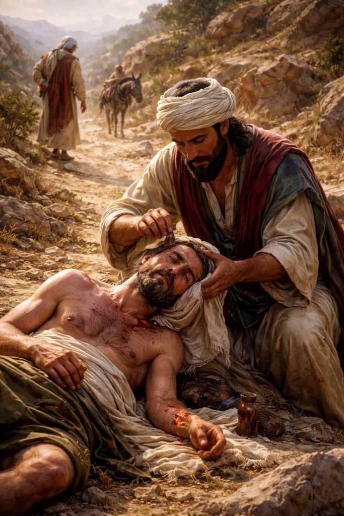 ”Vem är då min nästa?” Jesus svarade: ”En man var på väg från Jerusalem ner till Jeriko och råkade ut för rövare. De slet av honom kläderna och misshandlade honom, och sedan försvann de och lämnade honom där halvdöd. En präst råkade komma ner samma väg, och när han fick se mannen gick han förbi. På samma sätt var det med en levit. Han kom till platsen, såg mannen och gick förbi. Men en samarier som var på resa kom också dit, och när han såg mannen förbarmade han sig över honom. Han gick fram och hällde olja och vin i hans sår och förband dem. Sedan lyfte han upp honom på sin åsna, tog honom till ett värdshus och skötte om honom. Nästa dag tog han fram två denarer och gav till värdshusvärden och sade: Sköt om honom. Och kostar det mer ska jag betala när jag kommer tillbaka. Vem av dessa tre tycker du var en nästa för mannen som råkade ut för rövare?” Han svarade: ”Den som visade barmhärtighet mot honom.” Då sade Jesus till honom: ”Gå du och gör som han.”