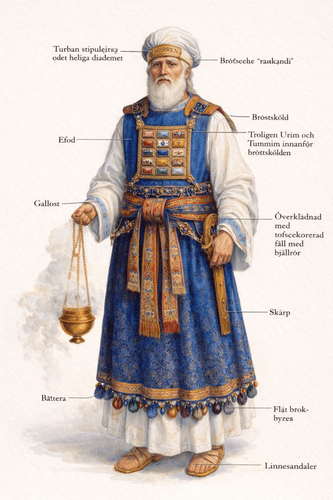 När översteprästen gick in det allra heligaste var han folkets representant.Allt det han hade på sin kläder vittnade om folket. De tolv stammarna. Urim och Tummim. Urim och Tummim är två föremål (troligtvis två mindre stenar eller stavar) som prästen bar i sin prästsköld och som antagligen användes för att kasta lott. För att särskilja i domslut.