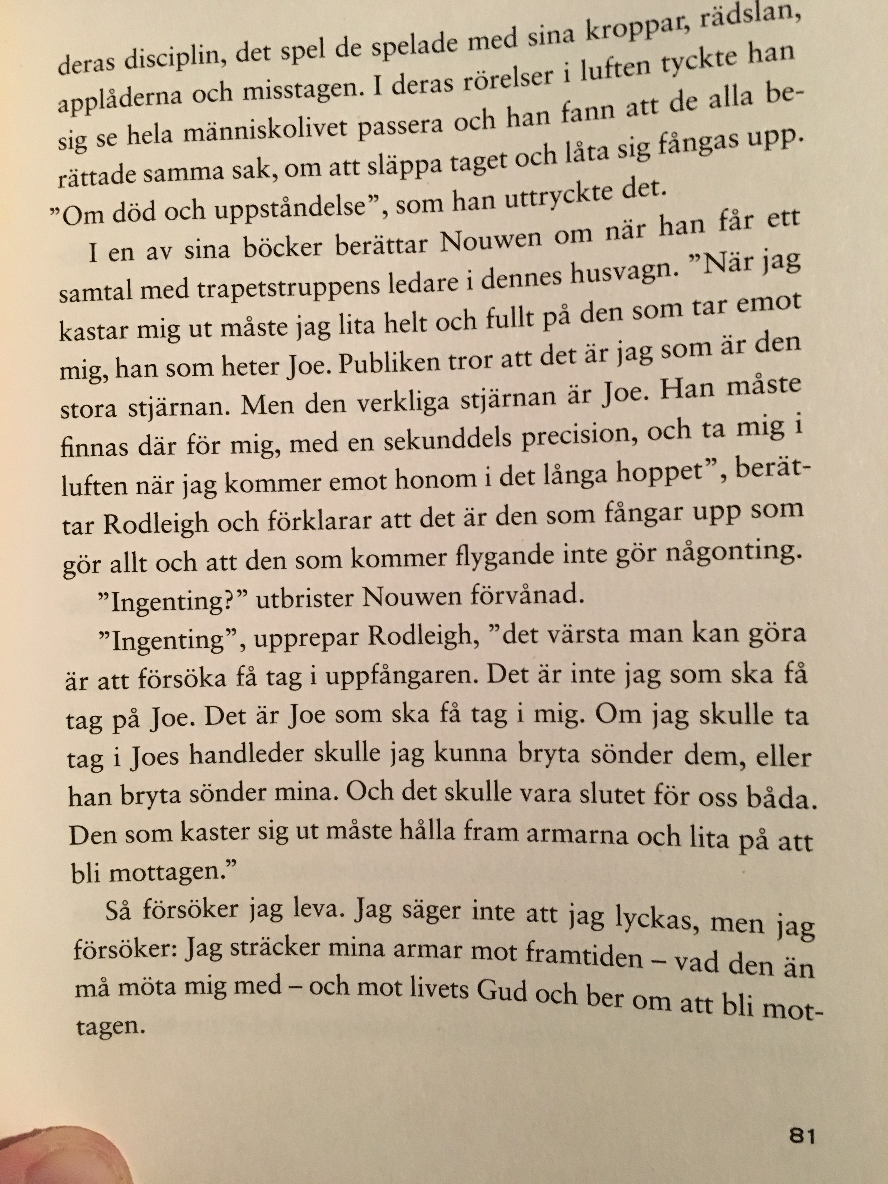 Berättelsen om trampolinhopparna är häftig på något sätt. Att inte krampaktigt själv försöka grabba tag. Utan vila i att bli uppfångad när jag kommer och sträcker ut mina händer mot Gud. Vilken tillit. Vilken vila.