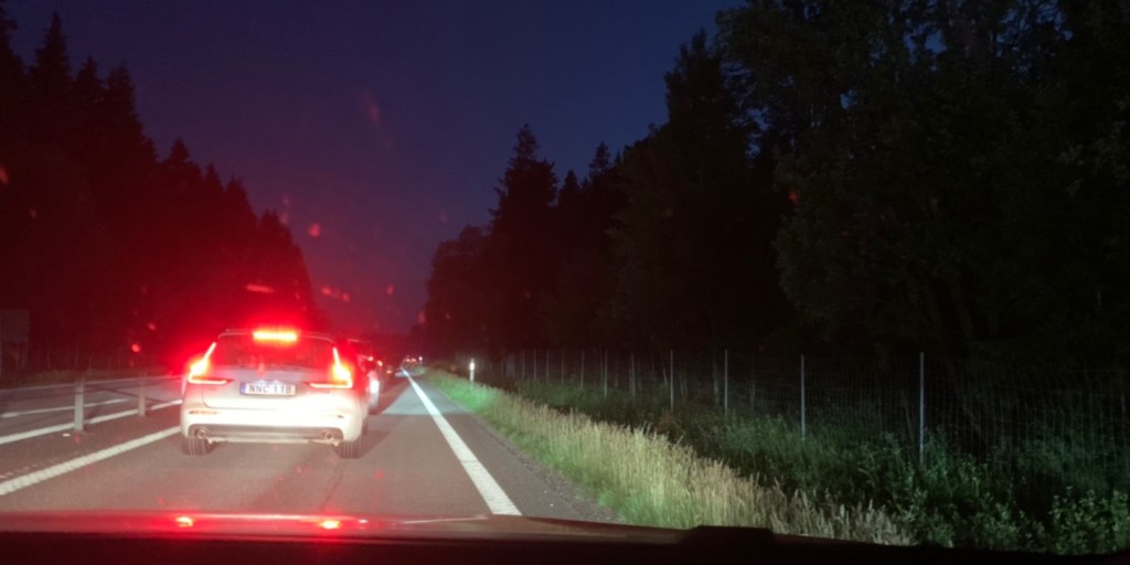 Kan bara känna stor tacksamhet. Denna gång var jag inte i den bil som krockade med älgen. Att stå i kö blir då rätt okej fast klockan var sent. Att det är en helg med mycket trafik gör att det blir olyckor tyvärr.