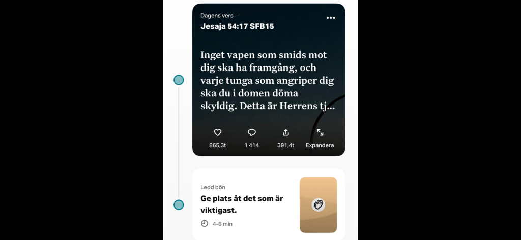 den är uppbyggd så att dagens bibelvers finns där. Sen kan man vara en stund i en ”Ledd bön”. Där står det: Ge plats åt det som är viktigast”. Under 4-6 minuter kan man ledas genom några tankar och en bönestund samt egen reflektion. När jag tryckte på den igår stod det: