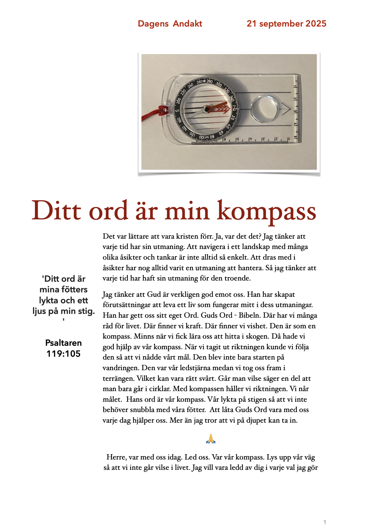 Publicerat den 22 september, 202520 september, 2025 av pedherskoogDagens Andakt – Ditt Ord är min kompass Dela detta: Klicka för att dela på X (Öppnas i ett nytt fönster) X Klicka för att dela på Facebook (Öppnas i ett nytt fönster) Facebook Klicka för att dela via LinkedIn (Öppnas i ett nytt fönster) LinkedIn Gilla Laddar in …