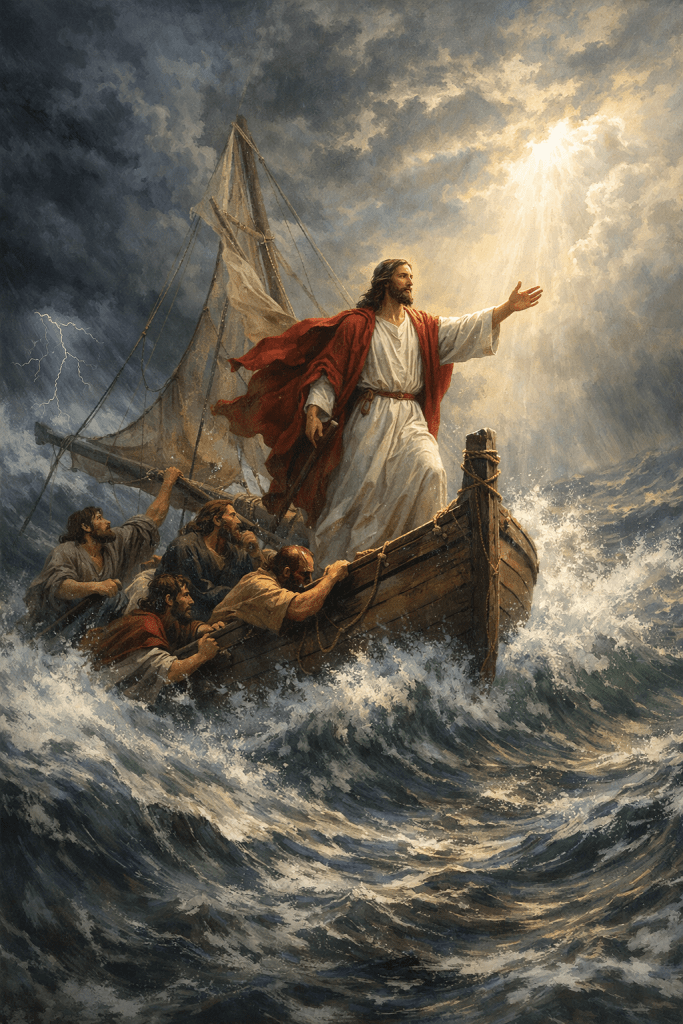 ”Han vaknade och talade strängt till vinden och sade till sjön: ”Tig! Var tyst!” Då lade sig vinden och det blev alldeles stilla.”