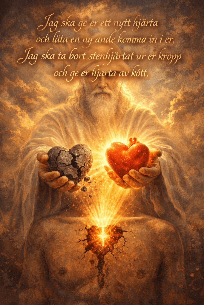 Jag ska ge er ett nytt hjärta och låta en ny ande komma in i er. Jag ska ta bort stenhjärtat ur er kropp och ge er ett hjärta av kött.