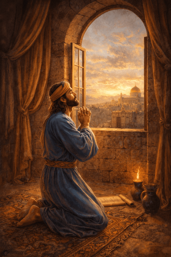 Så snart Daniel fick veta att skrivelsen var uppsatt, gick han in i sitt hus. På övervåningen hade han fönster öppna i riktning mot Jerusalem . Där föll han ner på sina knän tre gånger om dagen och bad och tackade sin Gud, precis som han tidigare brukat göra.