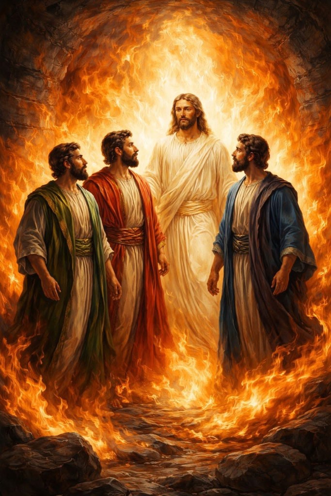 När kungen skall se om de var döda blir han minst sagt förvånad:”.. nu ser jag fyra män gå lösa och lediga inne i elden, helt oskadda. Och den fjärde ser ut som en gudason .”