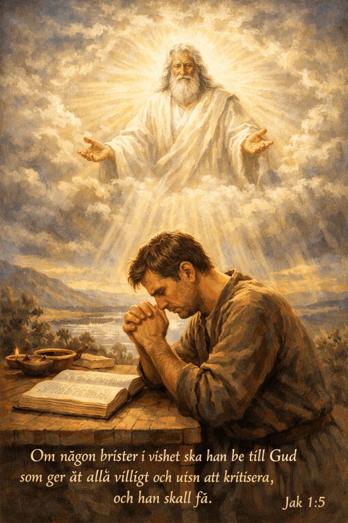 Om någon av er brister i vishet ska han be till Gud, som ger åt alla villigt och utan att kritisera, och han ska få.