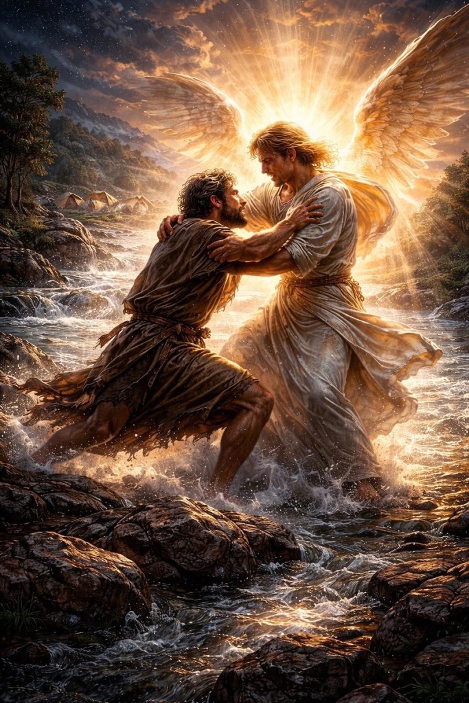 Jakobs kamp med Gudsmannen är en intressant händelse. Kampen verkar hård. Jakob står emot på ett märkligt sätt. Mitt i denna kamp slår mannen Jakobs höft ur led.Allt för att komma undan innan ljuset kommer.