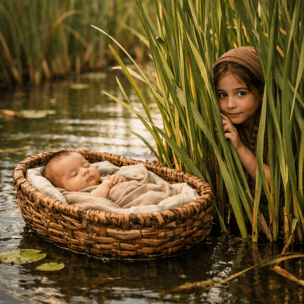 ”En man av Levi stam tog till hustru en levitisk kvinna. Hustrun blev havande och födde en son. Hon såg att det var ett vackert barn och höll honom gömd i tre månader. Men när hon inte kunde gömma honom längre, tog hon en korg av papyrus. Hon strök på beck och tjära, lade barnet i korgen och satte den i vassen vid Nilens strand. Hans syster ställde sig på avstånd för att se hur det skulle gå med honom.”