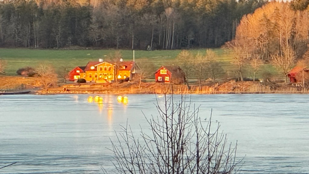 Igår eftermiddag när solen höll på att gå ner såg jag solen speglas i fönstren på huset på andra sidan sjön.