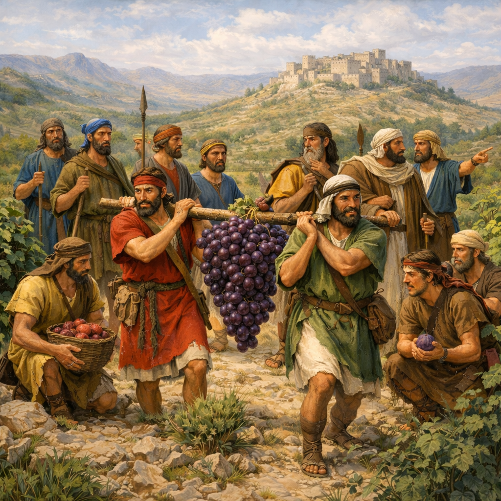 Mose får i uppdrag att sända ut tolv spejar för att se hur landet är. En ledare från varje stam.Man skulle bedöma landet. För att förbereda folket inför intåget till det landet Gud hade berett för dom.