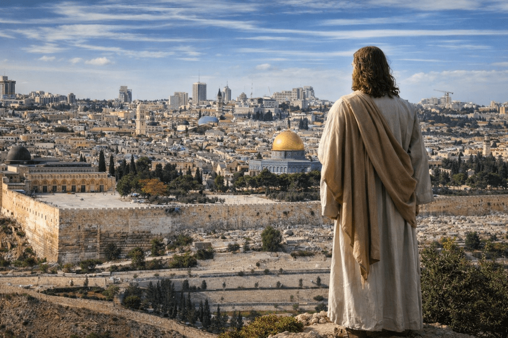 Jesus ser på den vackra staden Jerusalem. Han sörjer över att den inte förstår vad det är som verkligen ger den Frid. Han profeterar över den att den ska jämnas med marken.