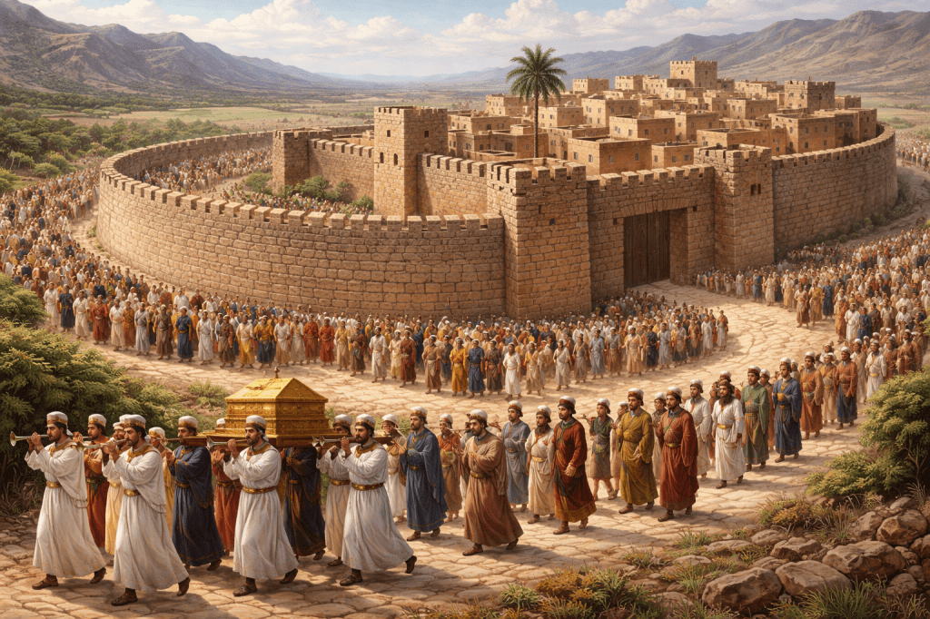 Strategin för folket var inte att strida själva. Gud gav en bättre strategi. Man skulle vandra runt staden. En gång per dag under 6 dagar. Den sjunde dagen skulle man gå sju varv. Alla varv innan detta varv skulle man vara tysta med man vandrade. Men denna gång skulle man i det sjunde varvet ge ett härskri. Då skulle murarna falla. Inte förrän dess.