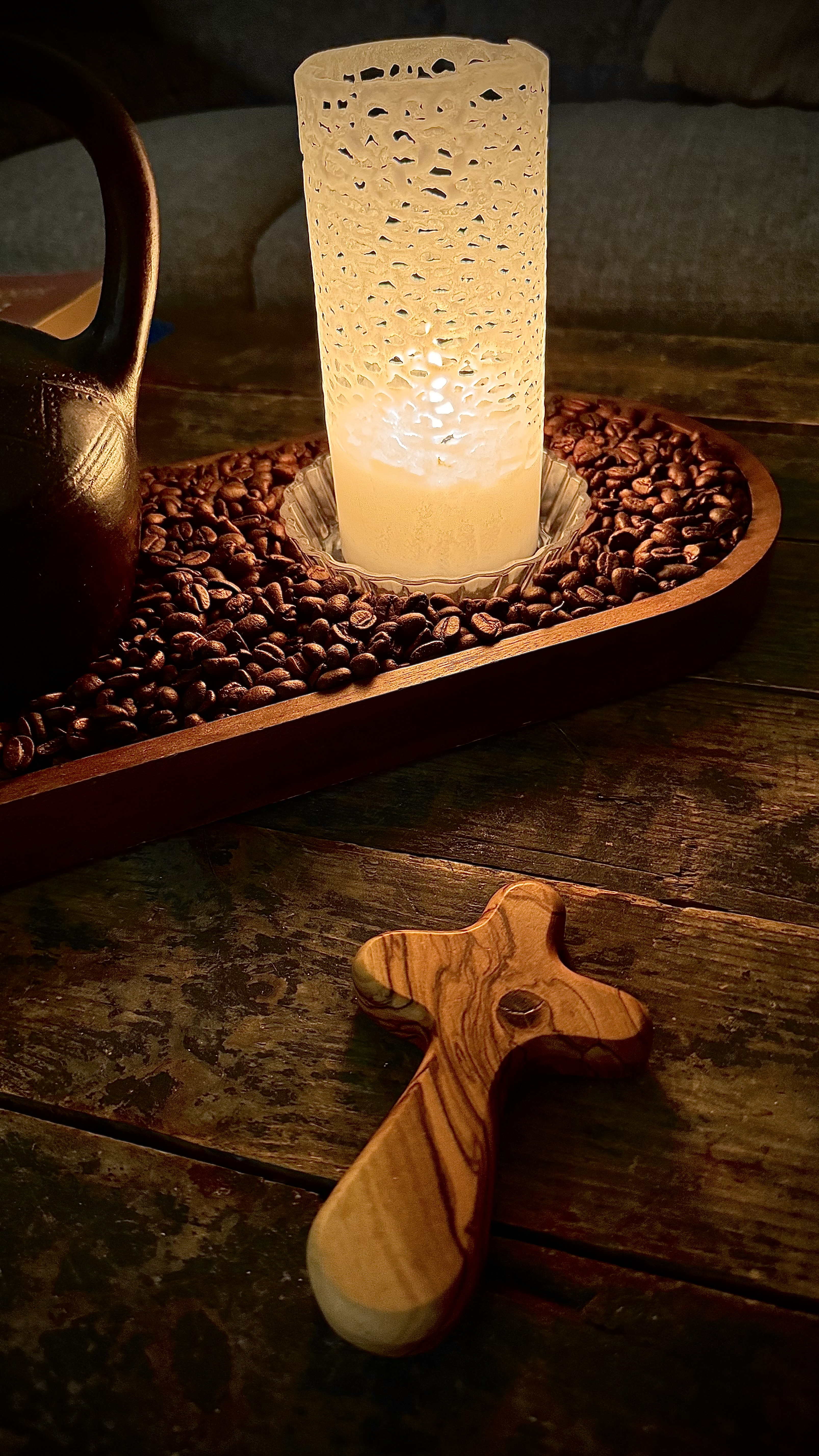 Jag satt och läste på den lapp som följde med korset. Det är gjort av Olivträd, förhand i Betlehem,
