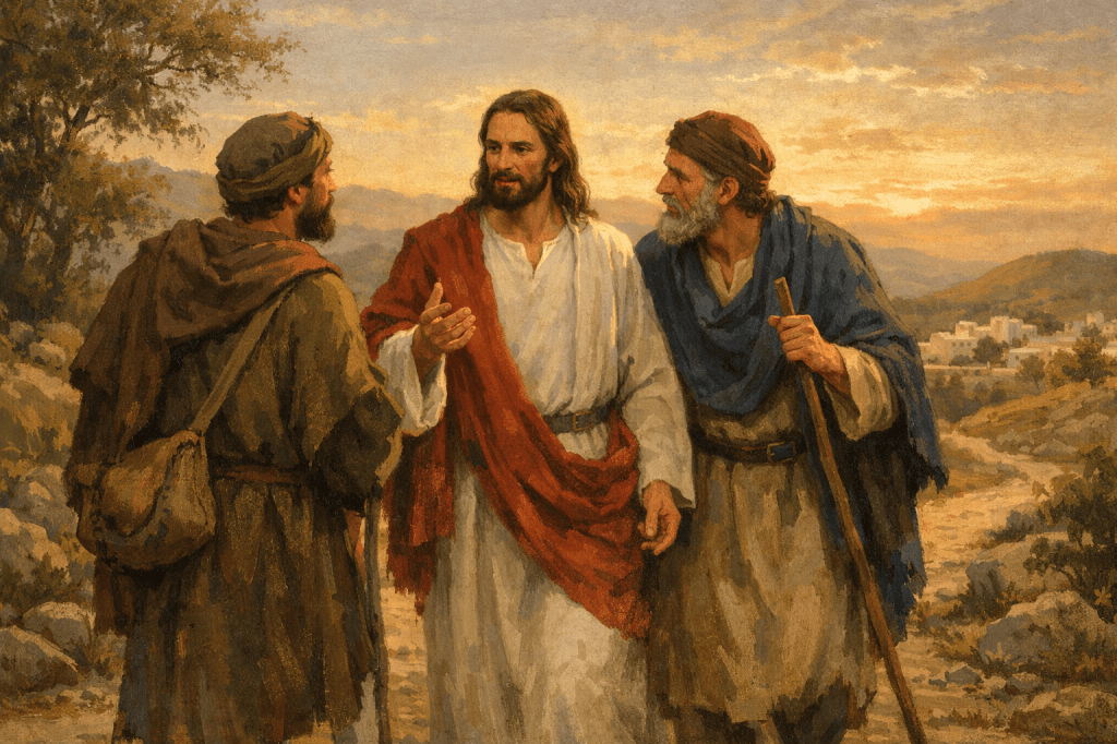 När dom går där så kommer en man ifatt dom. Denne man slår följe med dom. Och de förenas i samtalet. Mannen verkade kunna så mycket om mannen som nyligen korsfästs – Jesus. Så berättar han utifrån skrifterna varför allt detta hade hänt. Han var verkligen påläst.