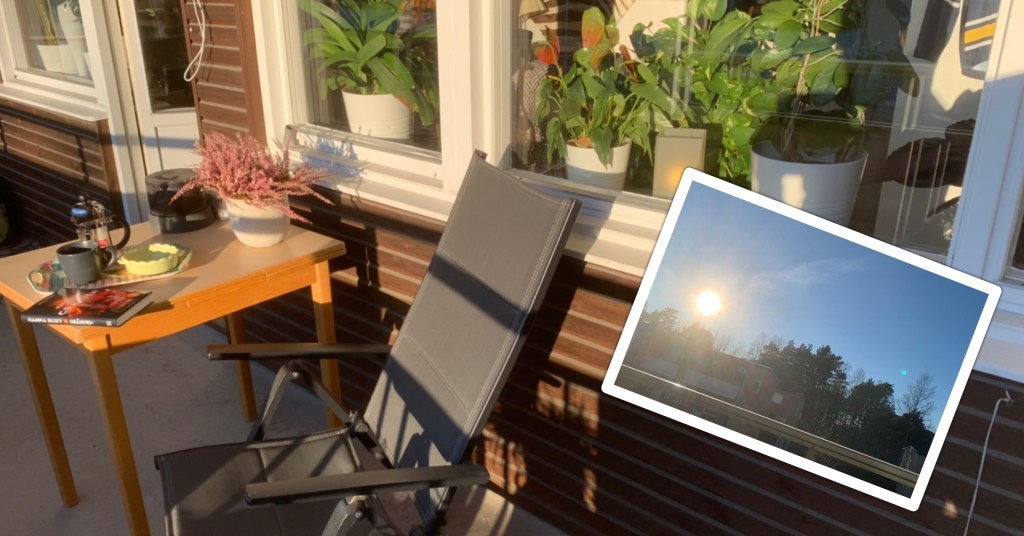 Så ljuvligt att njuta av denna plats. Igår var en riktigt go dag för balkonghäng så långe solen tittade fram på den. En bok. Lite fika. Lugn och ro efter en förmiddag med städning. Promenaden var inte heller så dum. Så hamnade jag där. Med en bra bok (Gränden av Hanna Blixt) och lite kaffe med en bulle.