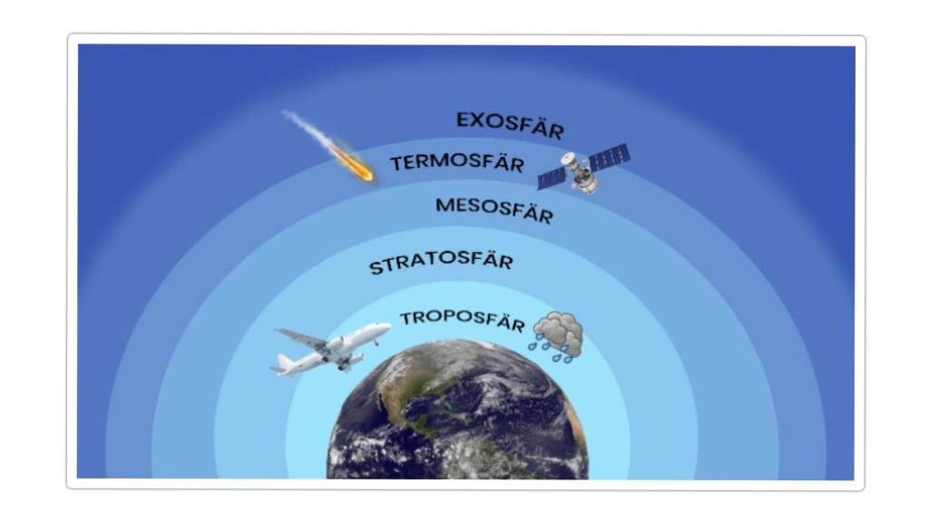 Jorden har många olika atmosfärer runt omkring sig. En har ozon som skyddar oss mig farlig strålning från solen. I en brinner stenar upp som kommer från rymden. I en stannar vårt syre. I en finns vårt väder. Den gör att regn bildas och sen regnar.