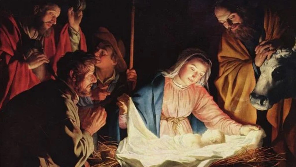 ”Vid den här tiden hade kejsaren Augustus gett order om att hela världen skulle skattskrivas. Det var den första skattskrivningen, och den gjordes när Quirinius var landshövding i Syrien. Var och en fick då resa till sin hemstad för att registrera sig. Eftersom Josef tillhörde Davids ätt, reste han från staden Nasaret i Galileen till Davids stad Betlehem i Judeen. Han tog med sig Maria, som han var trolovad med, och som nu väntade barn. Men medan de var där blev det dags för henne att föda, och hon födde sitt första barn, en pojke. Hon lindade honom sedan med tygstycken och lade honom i en krubba, för det fanns inte plats för dem inne i värdshuset. Samma natt var några herdar ute och vaktade sina får på fälten om natten. Då stod plötsligt en Herrens ängel framför dem, och Herrens härlighet lyste omkring dem. De blev fruktansvärt rädda, men ängeln sa till dem: ”Var inte rädda! Jag kommer till er med ett budskap om en stor glädje som gäller hela folket. Inatt har en Frälsare fötts åt er i Betlehem, Davids stad. Han är Messias, Herren. Det här är ett tecken för er: ni ska finna ett lindat barn som ligger i en krubba.” Och plötsligt var ängeln omgiven av en stor himmelsk här som prisade Gud: ”Ära till Gud i höjden, och frid på jorden, till dem som hans välvilja vilar över.” När änglarna hade farit tillbaka upp till himlen, sa herdarna till varandra: ”Kom! Vi måste gå till Betlehem och se det som har hänt och som Herren har låtit oss få veta!” Så skyndade de iväg och fann Maria och Josef och det nyfödda barnet som låg i krubban. Och när de hade sett barnet, berättade de för alla vad som hade sagts till dem om detta barn. Alla förvånades över herdarnas berättelse, men Maria lade allt detta på minnet och begrundade det i sitt hjärta.”