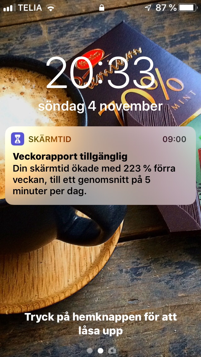 Igår blev jag klart överraskad. Jag hade ökat min skärmtid med 223% (!). Galet mycket. Nu tittade jag närmare på vad som stod. ”…till ett genomsnitt på 5 minuter per dag”. 😳😁🤭😂 Då var det ju inte så farligt. Sanningen behöver väl sägas. Det är den mobil jag har liggande hemma och den använda lite. 🙈