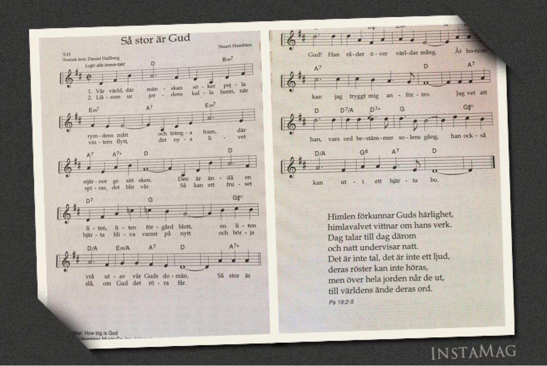 Så stor är Gud! Han råder över världar mång’. Åt honom kan jag tryggt mig anförtro. Jag vet att han, vars ord bestämmer solens gång, han också kan uti ett hjärta bo. Einar Ekberg