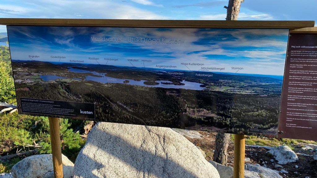 För några veckor sedan var jag vid utsikten Höga Kusten. Vägen dit är en slingrande väg som är rätt brant uppför. När man väl är uppe får man en bedårande utsikt. Har nog bara varit på några ställen, som tex Tegnértornet nära Grännaberget på Vätterns östra sida. 27 meter högt 144 trappsteg upp. 262 meter över Vättern. Men Utsikten Höga Kusten slår det mesta. En fantastisk utsikt och man ser hur långt som helst.