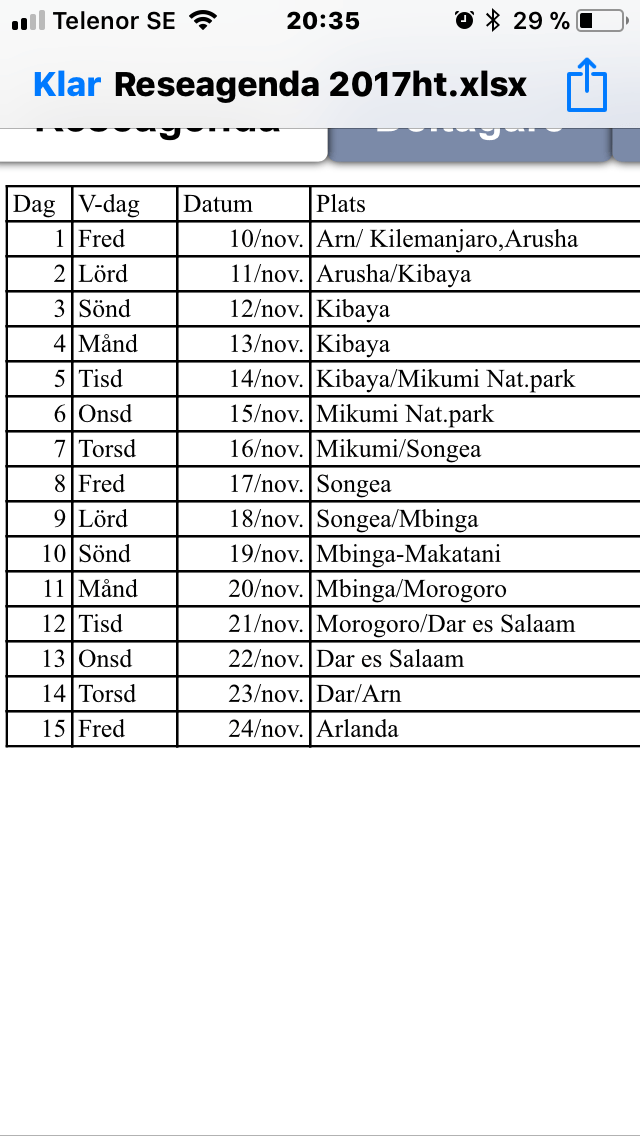 Nu har vi landat i Dar och kipepeo beach. Wi-fi fungerar dåligt Så några bilder blir det tyvärr kanske inte förrän vi kommer till flyget. Men några har ändå lyckats komma iväg trots allt