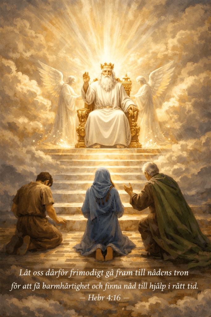 Därför – det är orsaken till till – kan vi gå fram frimodigt – frimodigt – till nådens tron. Du kommer inte att bli avhyst. Han vet – så du är verkligen välkommen. Du är verkligen välkommen ända fram till nådens tron. Vi behöver inte stanna en bit ifrån. Du får gå ända fram till Gud och den tron Han sitter på.