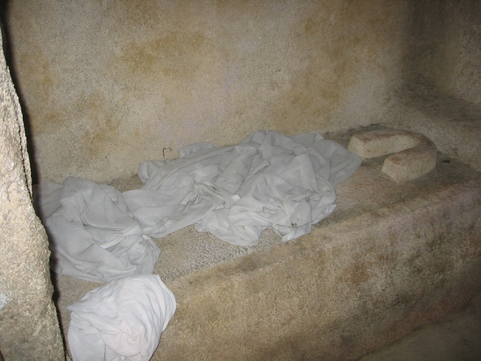 Jesus lämnade kvar linnetyget han var svept i. Teologerna menar att såsom han lämnade tygstyckena var en hälsning.”Jag kommer tillbaka”. Helt enkelt en hälsning om ett ”på återseende”.